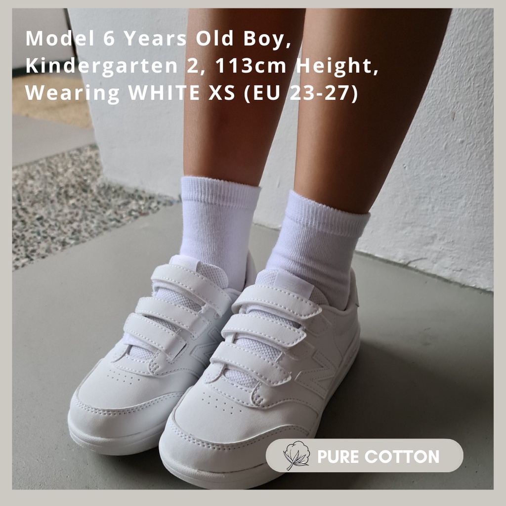 Material Quality:soft and comfortable Colour:white 3 pairs for $3.90. Good fit for a 5 yr old. Kids don’t have patience to wear long socks. This length is just nice.