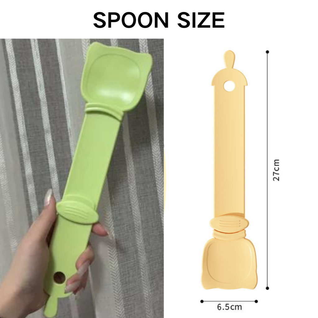 I’m very happy with this purchase. Actually I personally don’t think this is too big cos it fits the size n length of the treat! The bigger spoon surface is just to minimize any possible spills. ?? Very useful and washable after every use.