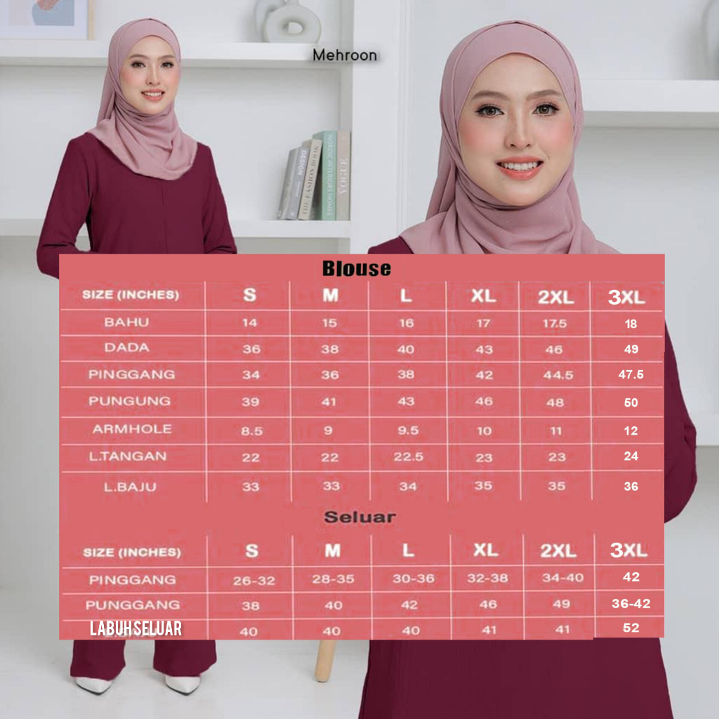 Colour:Black Material Quality:Crinkle material Nice and comfortable to wear. Went for a funeral or any occasion or daily wear is suitable. The material is not hot and the best part is ironless. Wuduk friendly. It came with a side pocket on the blouse. No pockets on the pants. Just take note of it.