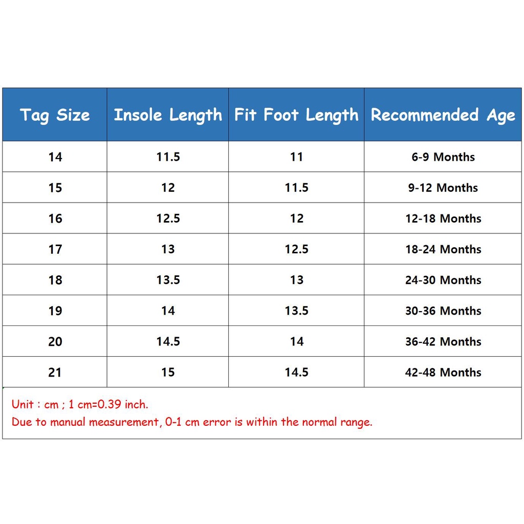 Each item was well packed and delivery was prompt. Both size 18 & 19 seems big & loose for my 15months baby. I bought based on his foot length of 13cm. Looks like have to keep & wear later.. and have to buy something else for him to wear to school now.