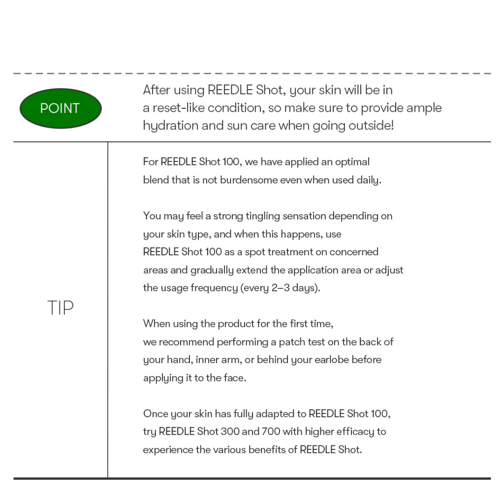 For skin: first time use First time using this product, so I still don't know how it works on my skin, the company comes with a lot of gifts I really like, there is a sd reedle shot in the lightest and most comfortable sample form. I see a slight start. Careful packing. Good shipping.